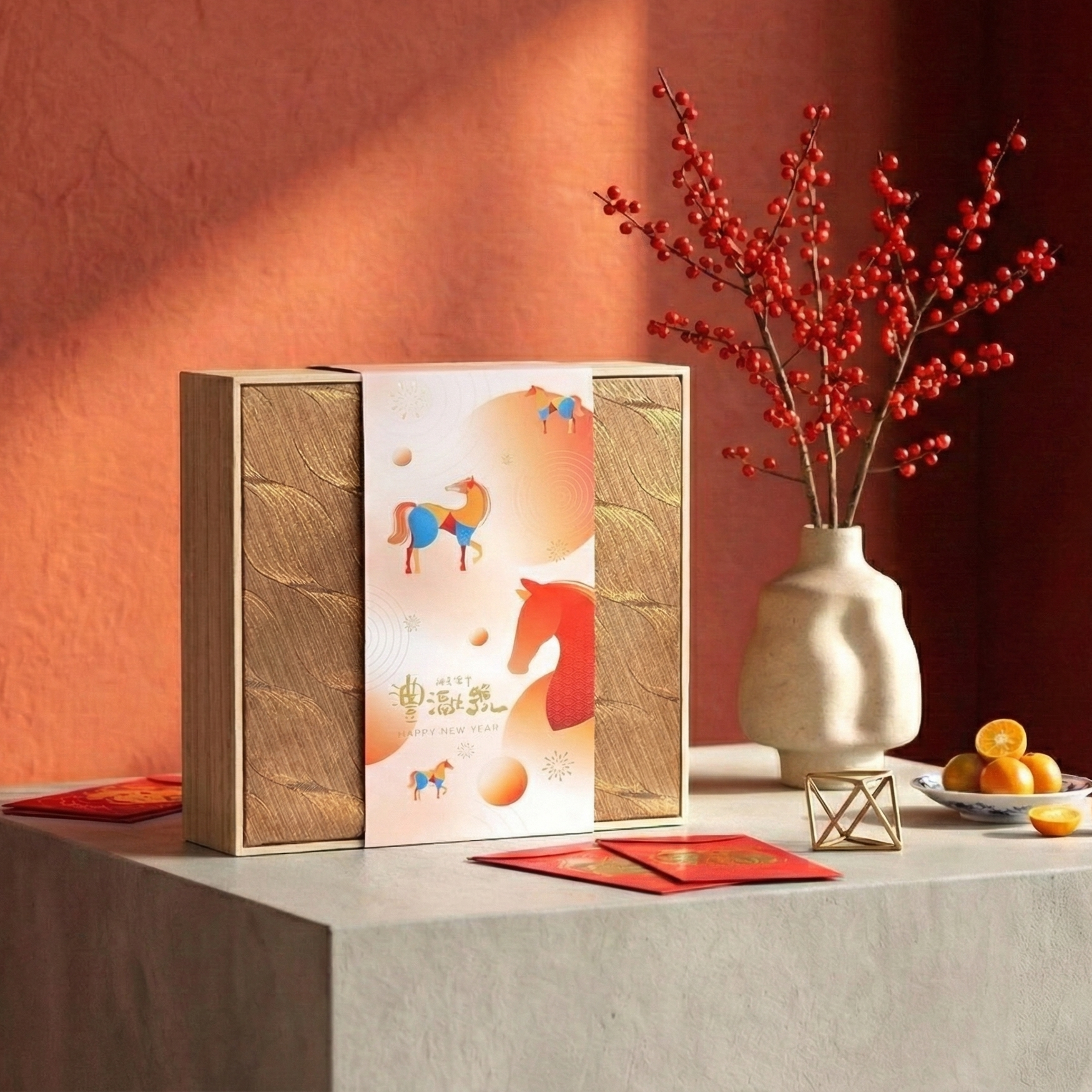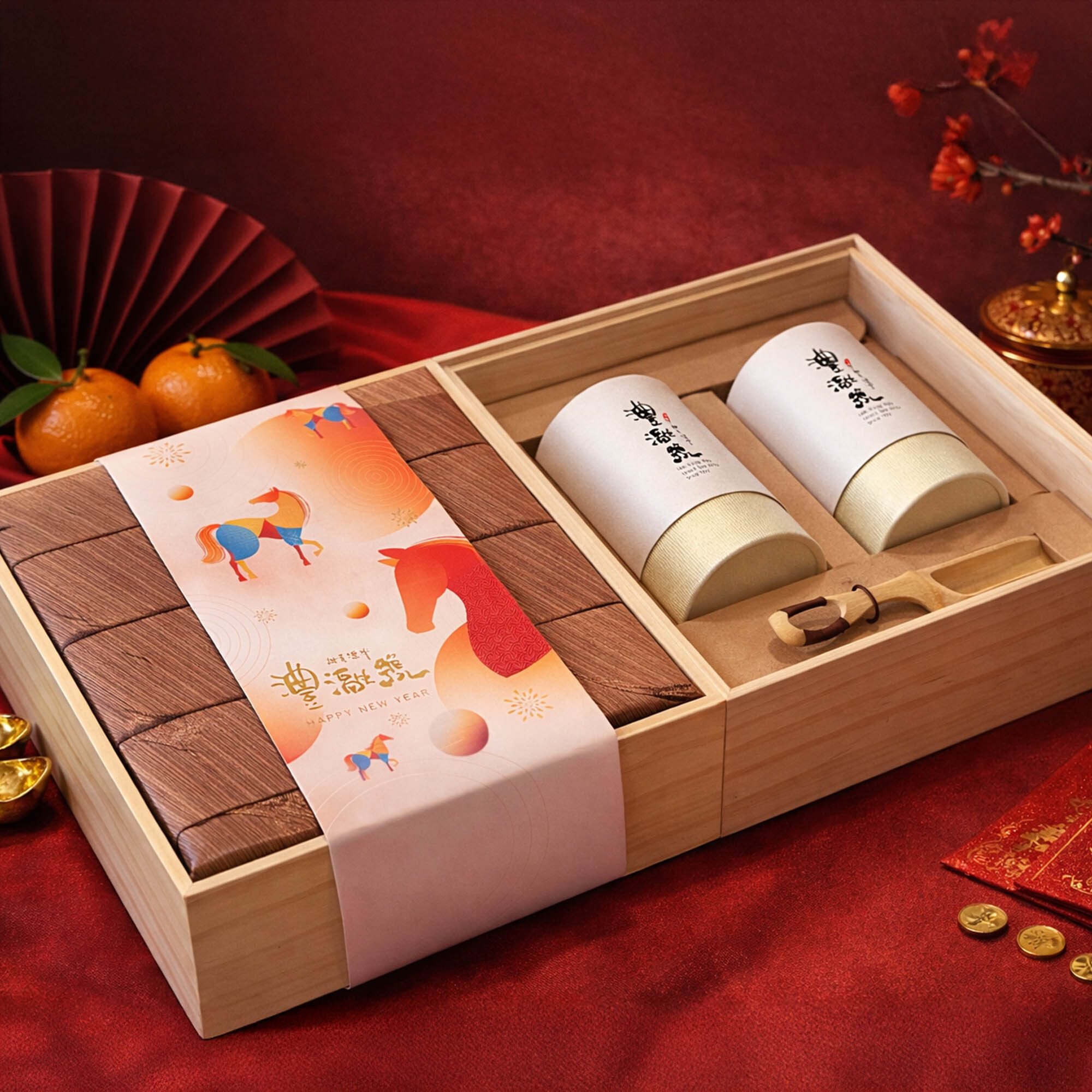 新春獻禮,首選「竹澧」。以溫潤厚實的木質禮盒,乘載著兩罐嚴選台灣頂級好茶。 封套設計融入「金馬奔騰」意象,幾何色塊堆疊出駿馬昂首之姿,象徵新的一年飛黃騰達、馬到成功。 這不僅是一份禮物,更是一份傳遞豐滋好味的真摯祝福。