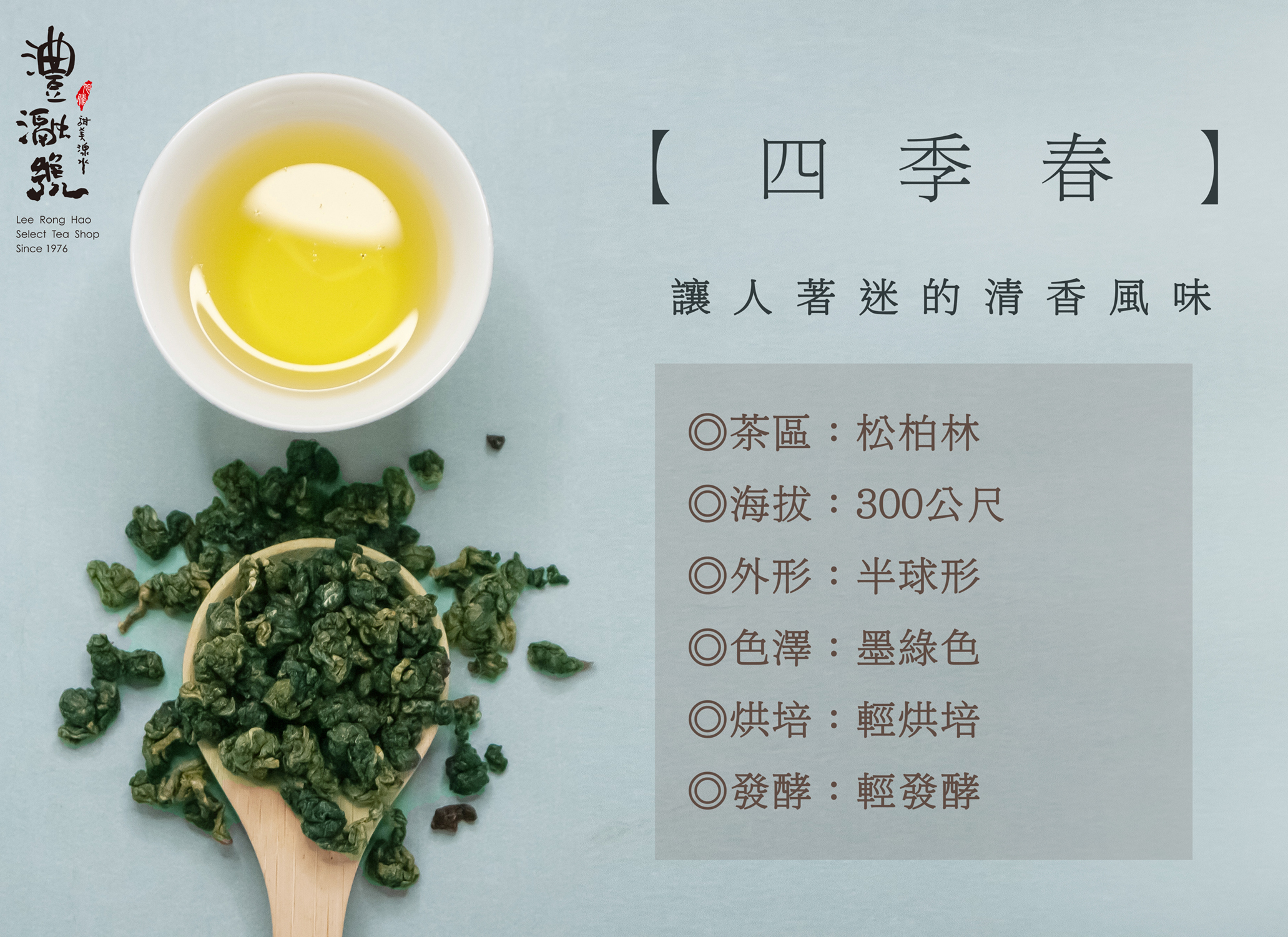 四季春茶,南投松柏嶺產區,約300公尺。天然花香、回甘順口,中海拔具高山冷韻。150g 四兩包,手採原葉。